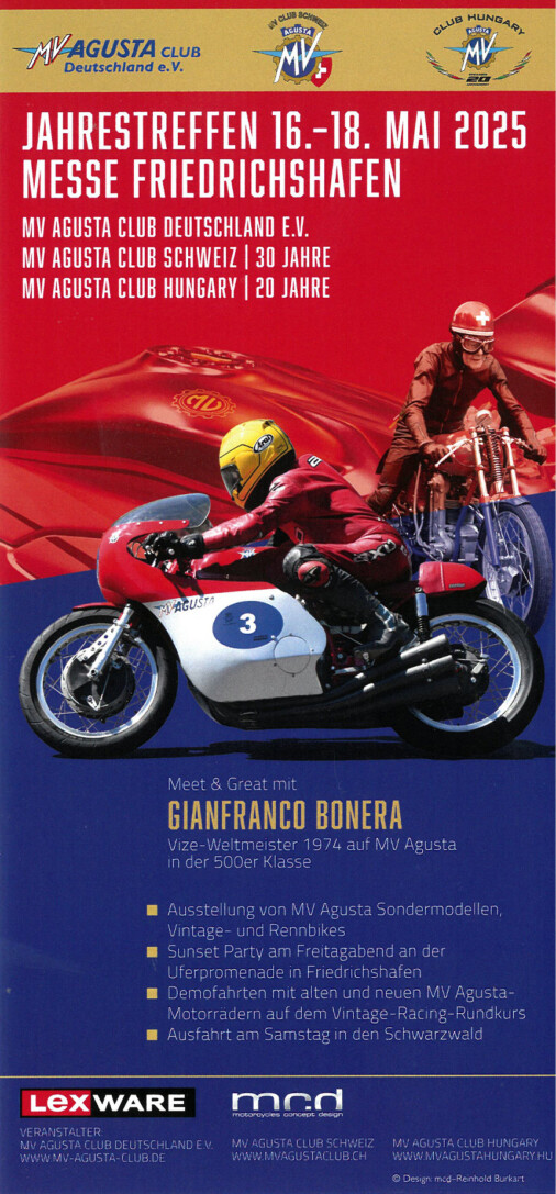 Die MV Agusta Clubs Deutschland, Schweiz und Ungarn treffen sich dieses Jahr in Friedrichshafenhafen bei der KLASSIKWELT BODENSEE.